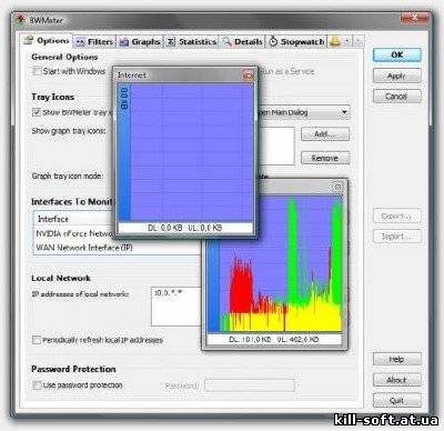 BWMeter - утилита для подсчета трафика и его графического отображения. Допускает раздельный подсчет внутрисетевого и исходящего / входящего интернет-трафика (для этого имеются настраиваемые фильтры). Кроме этого, BWMeter позволяет позволяет производить учет переданных пакетов, причем можно узнать, откуда и куда они направляются, к какому порту и по какому протоколу. Итоги всех этих подсчетов могут выводиться как в как графическом виде, так и в виде обычных цифровых отчетов.